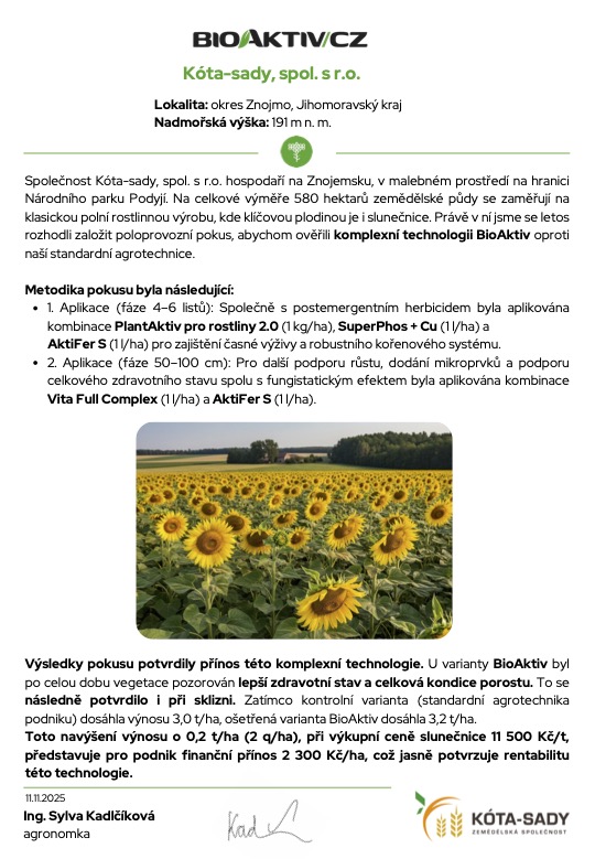 Společnost Kóta-sady, spol. s r.o. hospodaří na Znojemsku, v malebném prostředí na hranici Národního parku Podyjí. Na celkové výměře 580 hektarů zemědělské půdy se zaměřují na klasickou polní rostlinnou výrobu, kde klíčovou plodinou je i slunečnice. Právě v ní jsme se letos rozhodli založit poloprovozní pokus, abychom ověřili komplexní technologii BioAktiv oproti naší standardní agrotechnice.