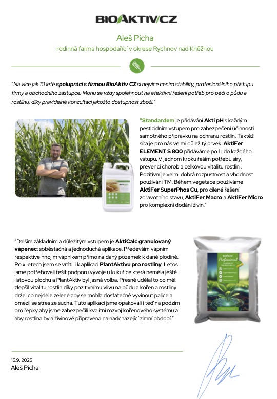 “Dalším základním a důležitým vstupem je AktiCalc granulovaný vápenec: soběstačná a jednoduchá aplikace. Především vápním respektive hnojím vápníkem přímo na daný pozemek k dané plodině. Po x letech jsem se vrátil i k aplikaci PlantAktivu pro rostliny. Letos jsme potřebovali řešit podporu vývoje u kukuřice která neměla ještě listovou plochu a PlantAktiv byl jasná volba. Přesně udělal to co měl: zlepšil vitalitu rostlin díky pozitivnímu vlivu na půdu a kořen a rostliny držel co nejdéle zelené aby se mohla dostatečně vyvinout palice a omezil se stres ze sucha. Tuto aplikaci jsme opakovali i teď na podzim pro řepky aby jsme zabezpečili kvalitní rozvoj kořenového systému a aby rostlina byla živinově připravena na nadcházející zimní období.”