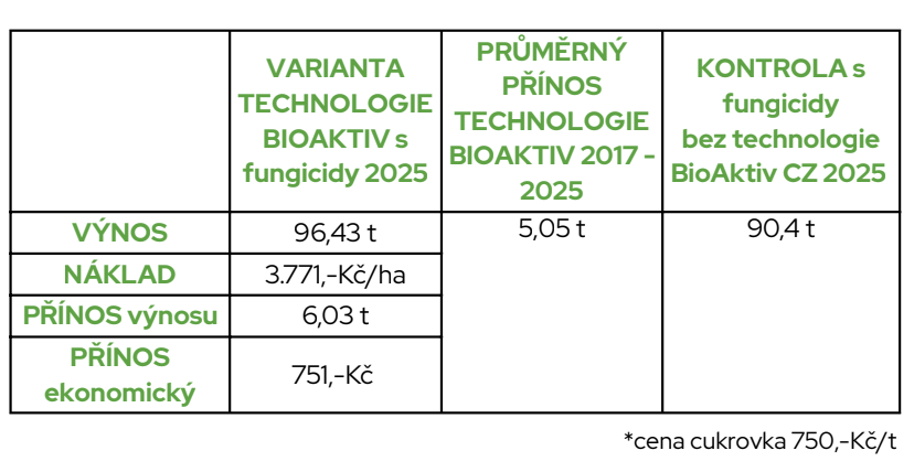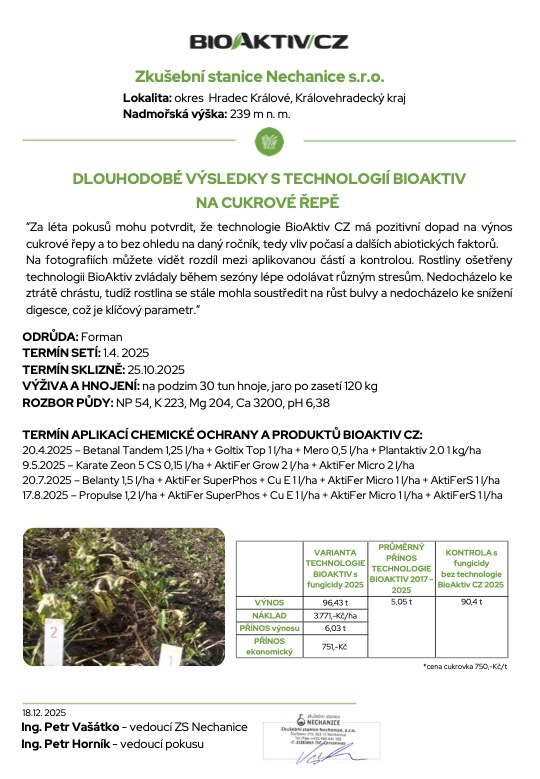“Za léta pokusů mohu potvrdit, že technologie BioAktiv CZ má pozitivní dopad na výnos cukrové řepy a to bez ohledu na daný ročník, tedy vliv počasí a dalších abiotických faktorů. Na fotografiích můžete vidět rozdíl mezi aplikovanou částí a kontrolou. Rostliny ošetřeny technologii BioAktiv zvládaly během sezóny lépe odolávat různým stresům. Nedocházelo ke ztrátě chrástu, tudíž rostlina se stále mohla soustředit na růst bulvy a nedocházelo ke snížení digesce, což je klíčový parametr.”