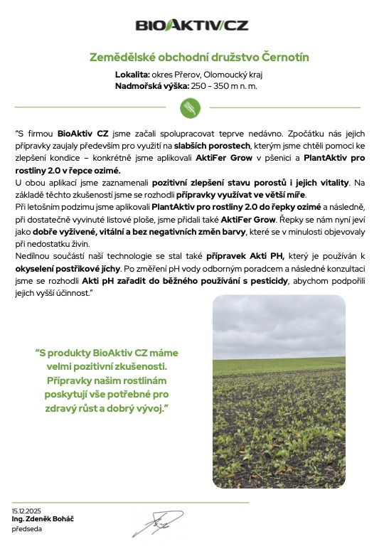 “S firmou BioAktiv CZ jsme začali spolupracovat teprve nedávno. Zpočátku nás jejich přípravky zaujaly především pro využití na slabších porostech, kterým jsme chtěli pomoci ke zlepšení kondice – konkrétně jsme aplikovali AktiFer Grow v pšenici a PlantAktiv pro rostliny 2.0 v řepce ozimé.