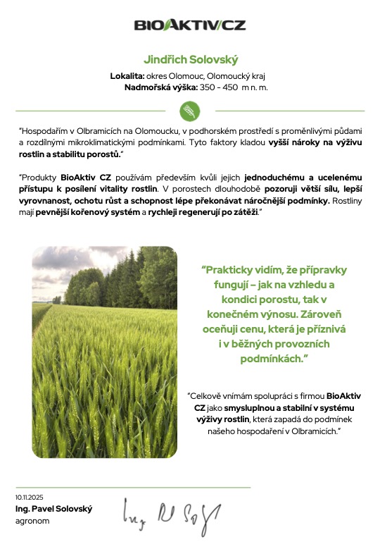 “Celkově vnímám spolupráci s firmou BioAktiv CZ jako smysluplnou a stabilní v systému výživy rostlin, která zapadá do podmínek našeho hospodaření v Olbramicích.”