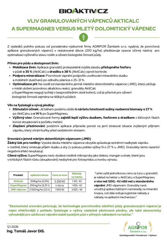 Z výsledků polního pokusu od poradensko-výzkumné firmy AGRIPOR Žamberk s.r.o. vyplývá, že povrchová aplikace granulovaných vápenců v redukované dávce (250 kg/ha) představuje vysoce účinný nástroj pro optimalizaci výživného stavu rostlin a oživení biologické činnosti půdy.